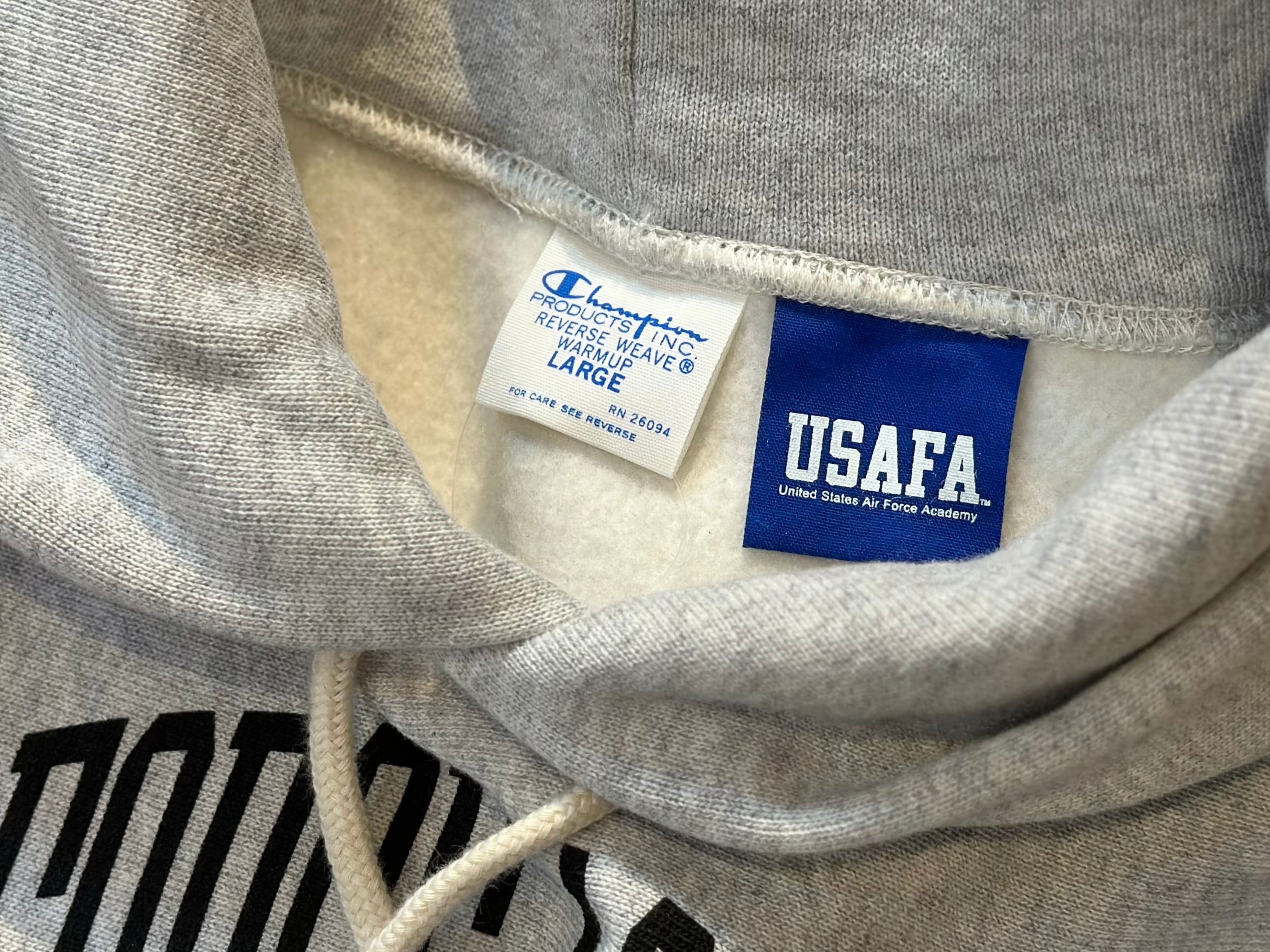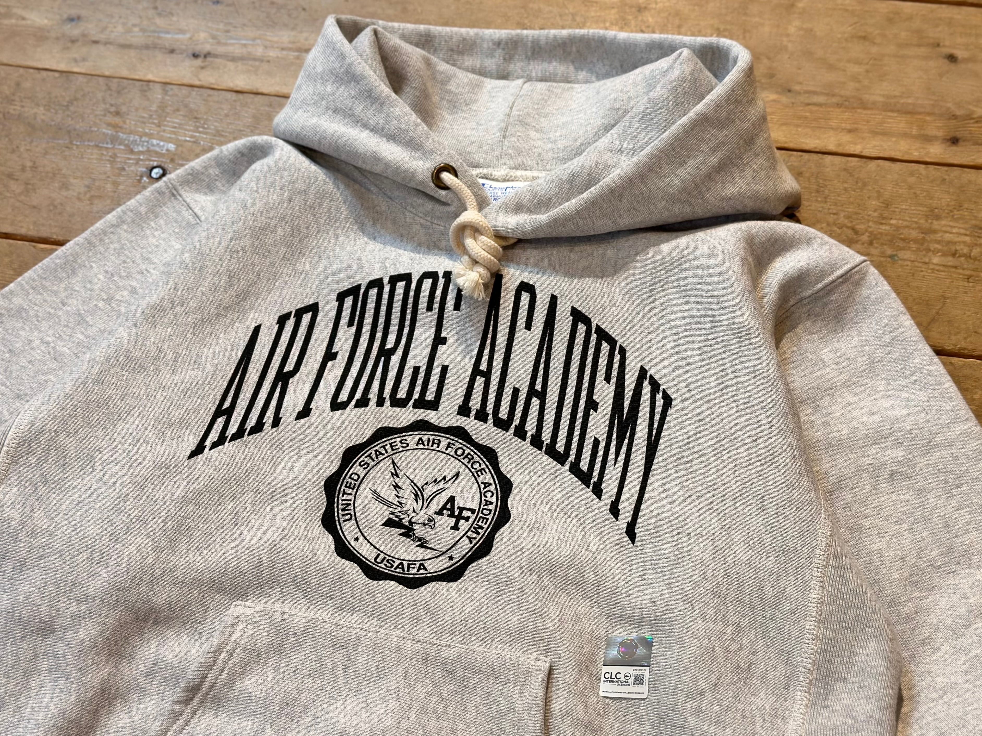 Champion®(チャンピオン)のスウェットシャツは、「ザ キング オブ スウェットシャツ」と評されるほど、世界中の多くのファンに愛されてきました。チャンピオンを代表する製法の「REVERSE WEAVE®(リバースウィーブ®)」。洗うほどにタフになり、着こむほどに独特の風合いや味が出る裏起毛素材を使用した「REVERSE WEAVE® 11.5oz. Terry Fleece(リバースウィーブ® 11.5オンス テリーフリース)」シリーズのフーデッドスウェットシャツです。コットン素材は環境に配慮して生産されたサステナブルなアメリカ綿を100%使用。本来は縦方向に使われる生地を横方向に使用する「REVERSE WEAVE®」製法によって縦の生地の縮みを防ぐと同時に、両脇に「EXPANSION GUSSET(エクスパンションガゼット)」を付けることで横の縮みへの影響を少なくし、動きやすさに配慮しています。胸のグラフィックはアメリカ合衆国の空軍士官学校(United States Air Force Academy)をモチーフにしたもので、「AIR FORCE ACADEMY(エア フォース アカデミー)」と校章を組み合わせた染み込みプリント。ネームタグは1970年代モデルの「青単タグ」(青単色タグ)を採用。アメリカの空軍士官学校は、士官候補生が正規士官として勤務するために必要な能力やリーダーシップ、知識を育成する4年制の学校。卒業生は理学士(Bachelor of Science)の学位を取得し、空軍少尉もしくは宇宙軍少尉に任官します。