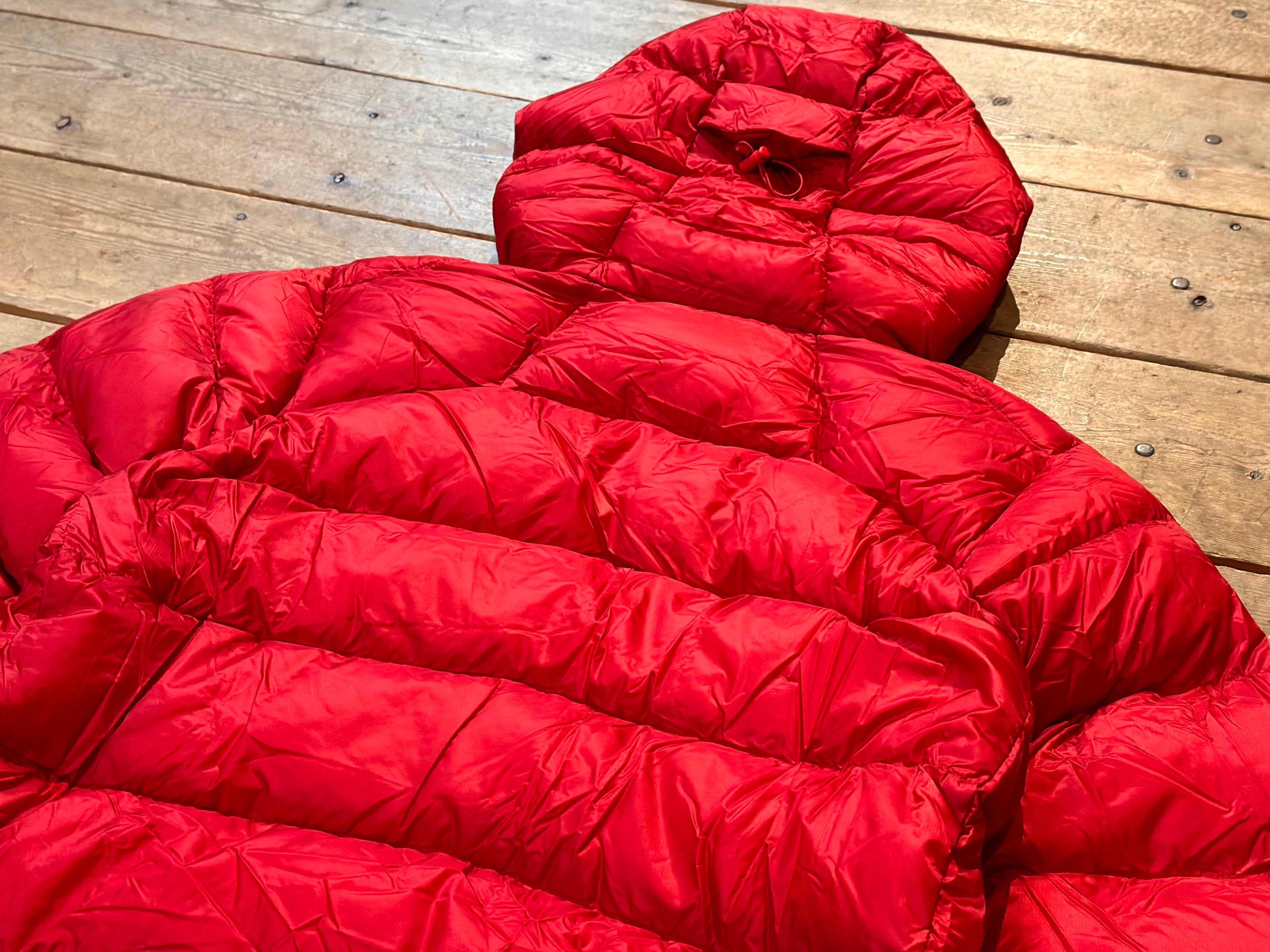 シェル:1.1オンス・20デニール・パーテックス・クアンタム・リサイクル・ナイロン100%のダウンが抜け出しにくいリップストップ。PFASを意図的に使用せずに製造されたDWR(耐久性撥水)加工済み