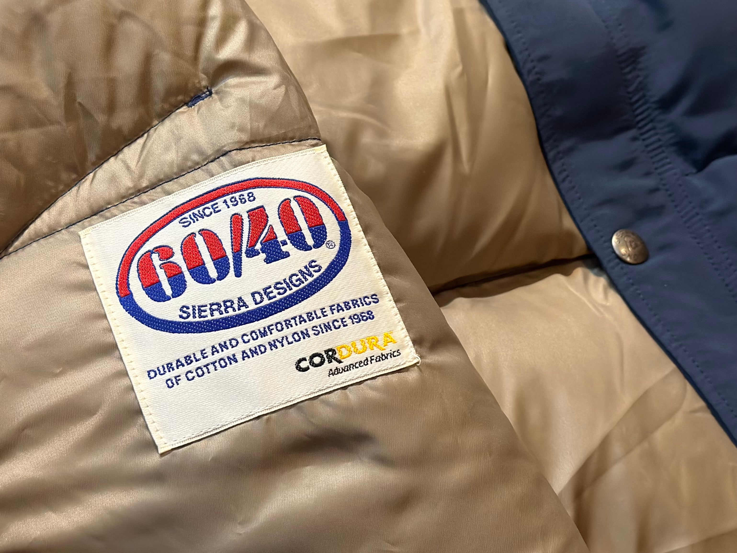 60/40クロスといえば、SIERRA DESIGNSが1968年にマウンテンパーカーに使用し、一世を風靡した、SIERRA DESIGNSの代名詞とも言える生地で、横糸にコットン、縦糸にナイロンを使用し、それぞれ60:40の比率で織り上げられたものです。