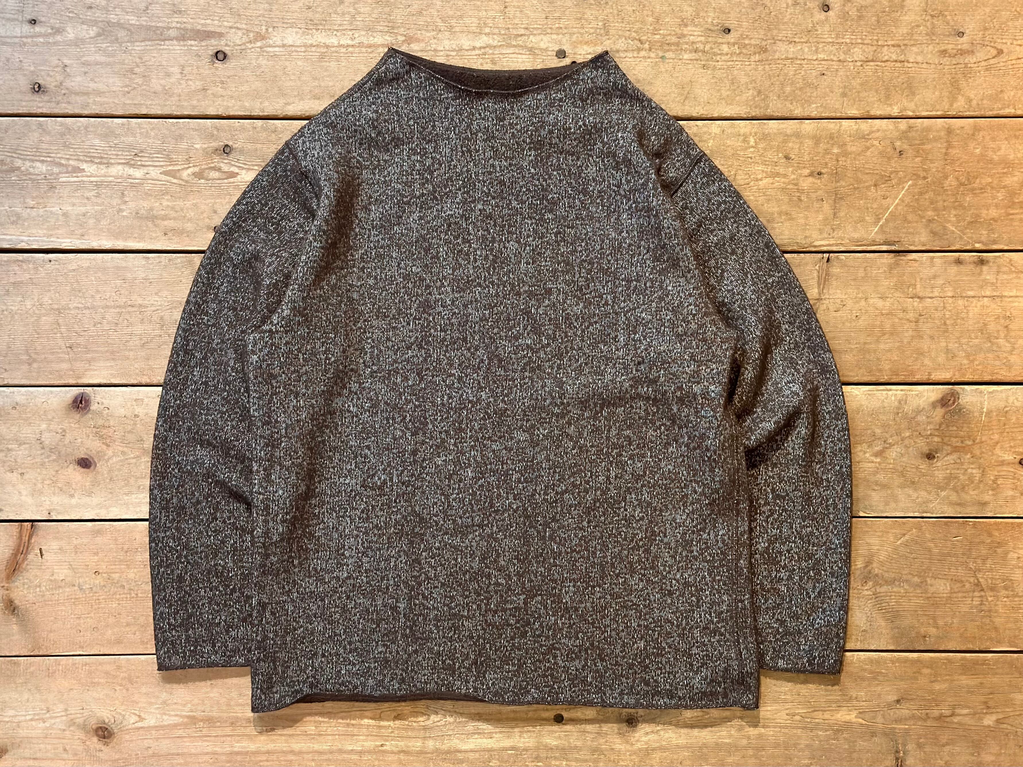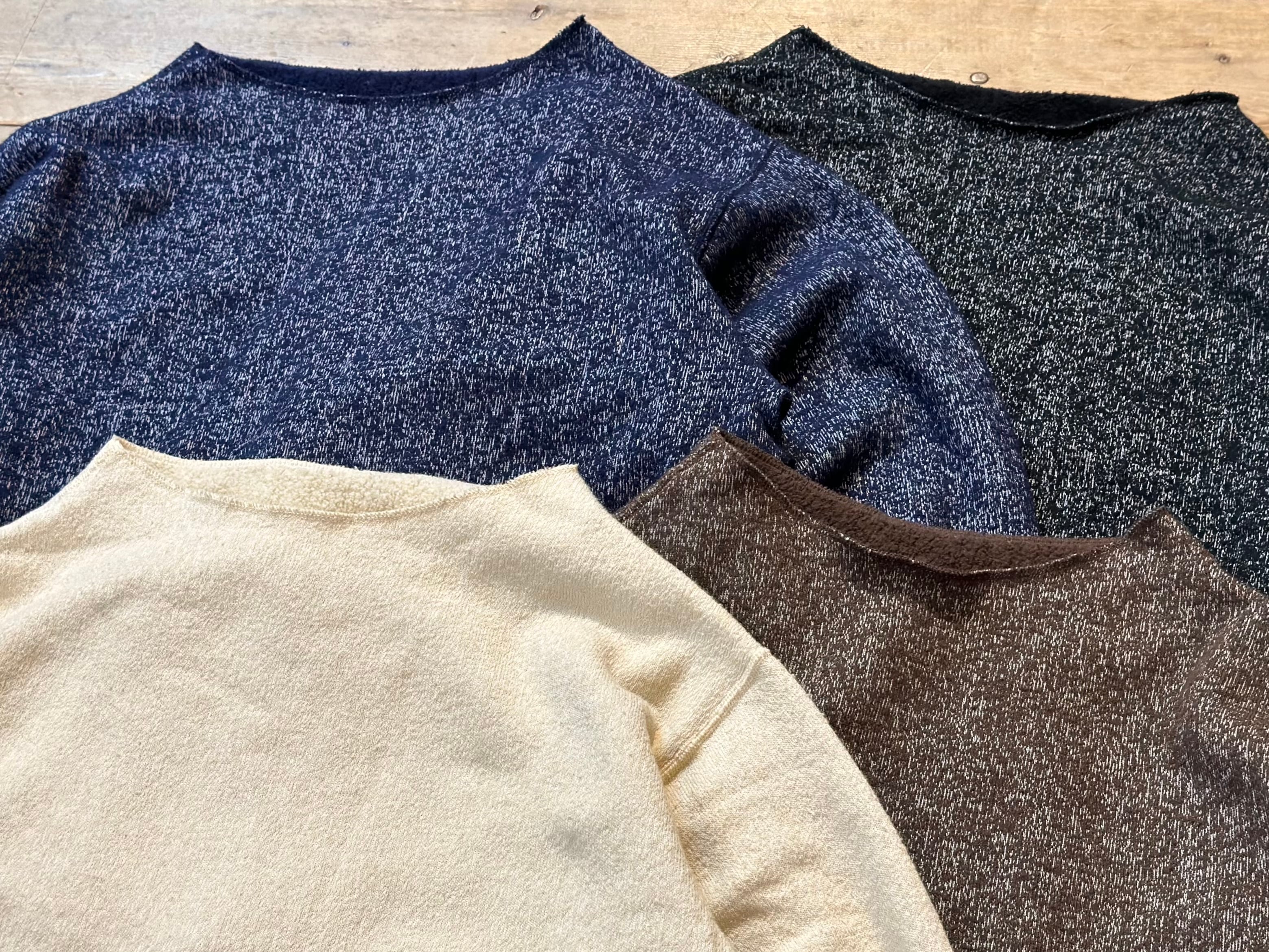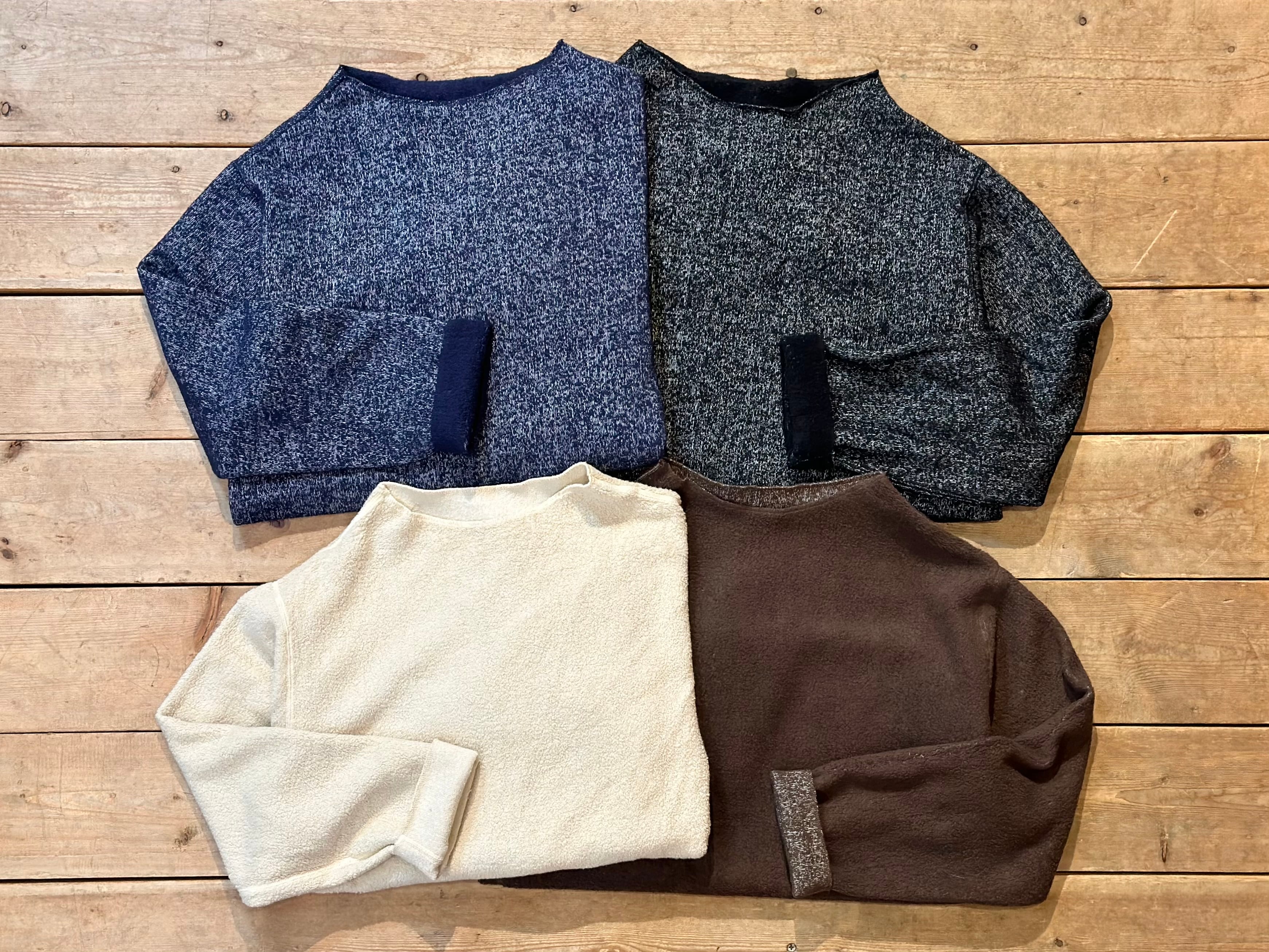 ニットとフリースとスウェットの中間のような独特な印象の生地は、肌触りや弾力性、保温性に優れ、柔らかな風合い感と温かみのある見た目も特徴的。