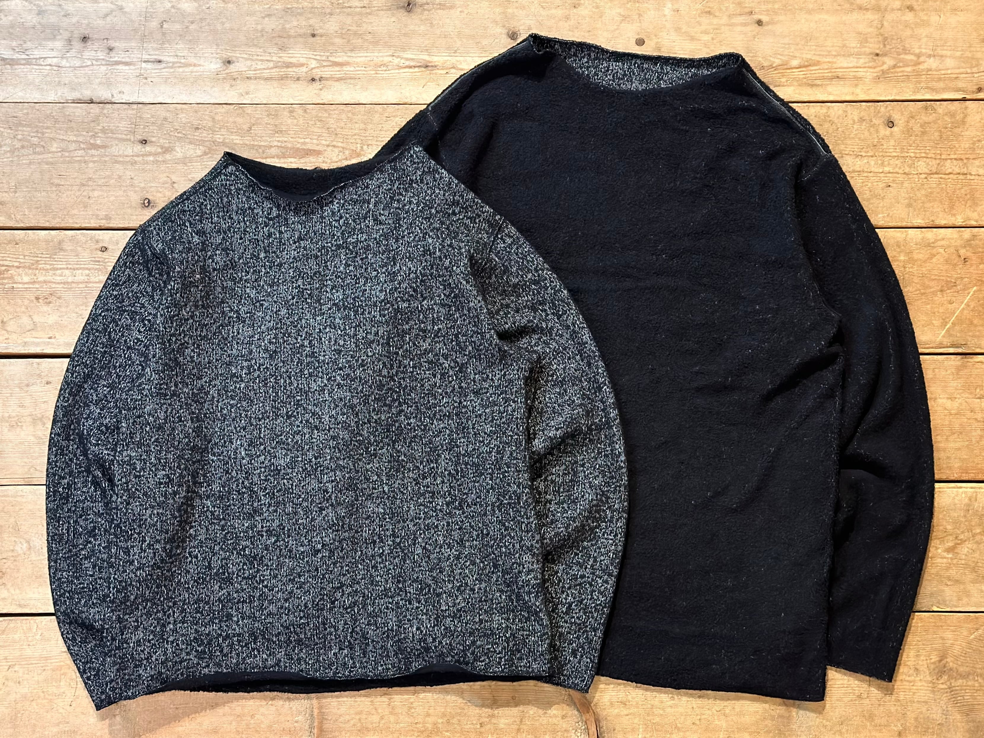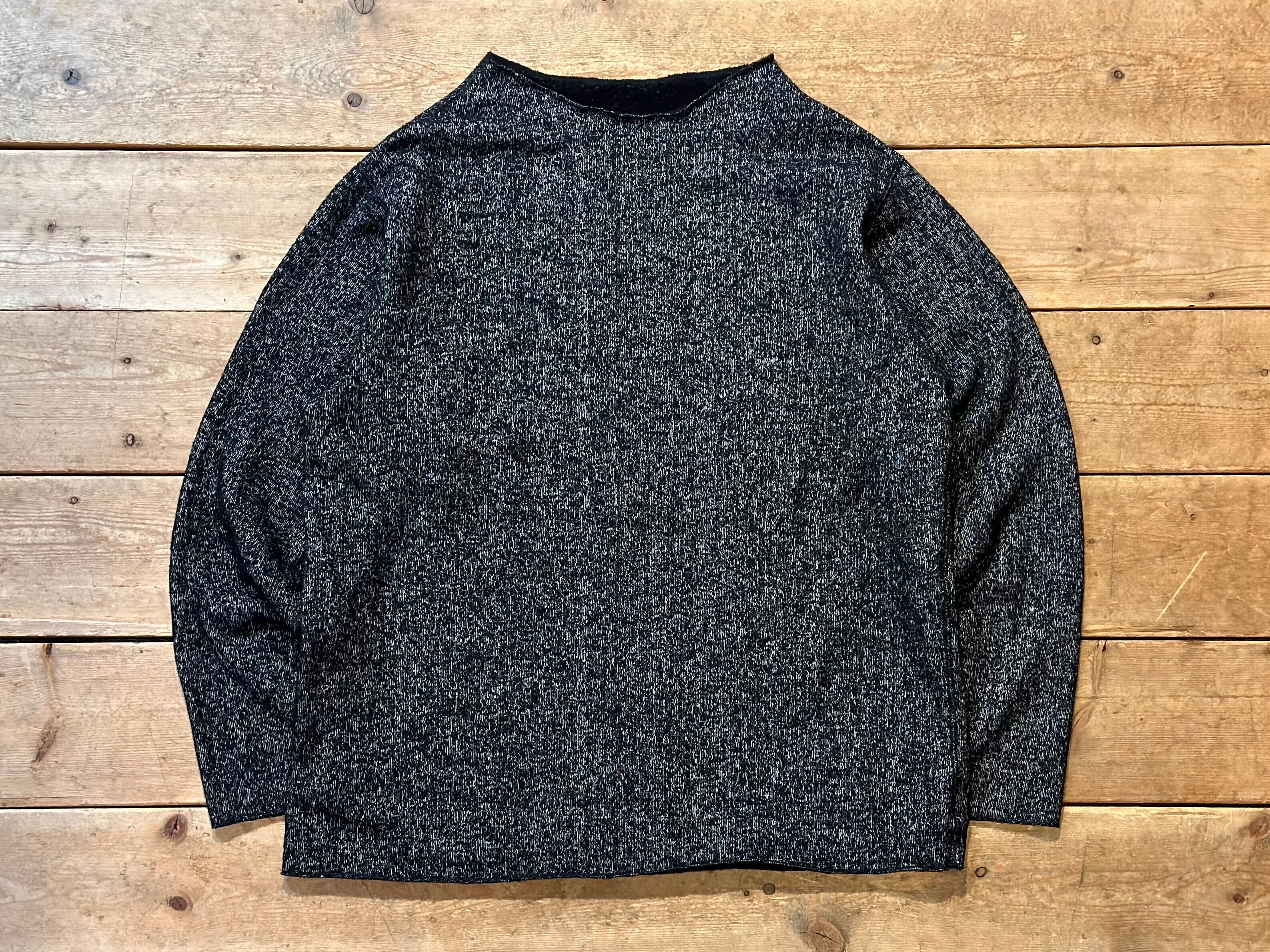 すっきりとした印象の浅めのボトルネック、袖口、裾、袖口はカットオフ+ロックステッチ仕様で、ラフな風合い感のある仕上がりとなっています。