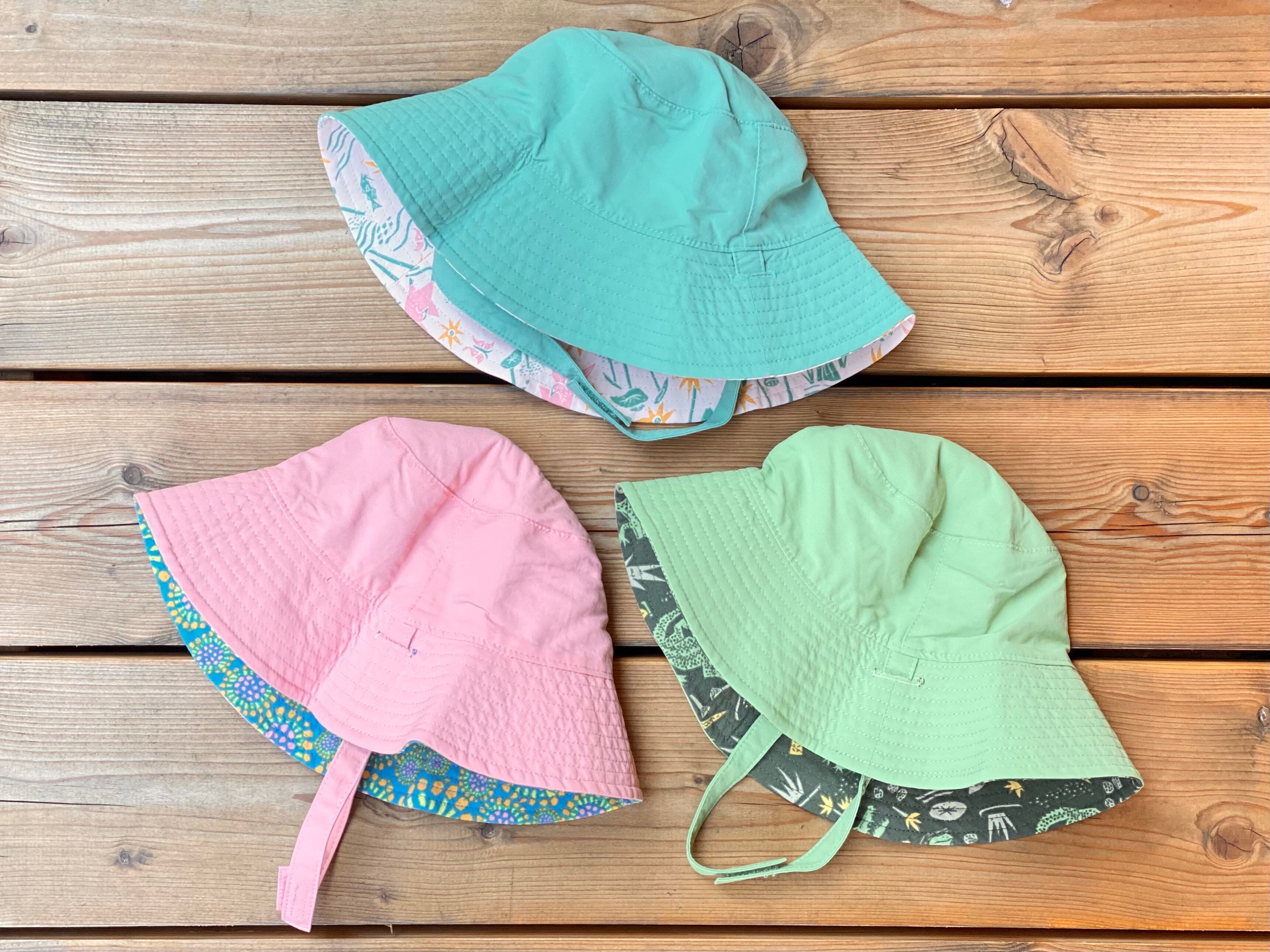 カラフルなプリントを使ったリバーシブルのデザインで、大きめのつばが頭と顔と首を日差しから守ります。
