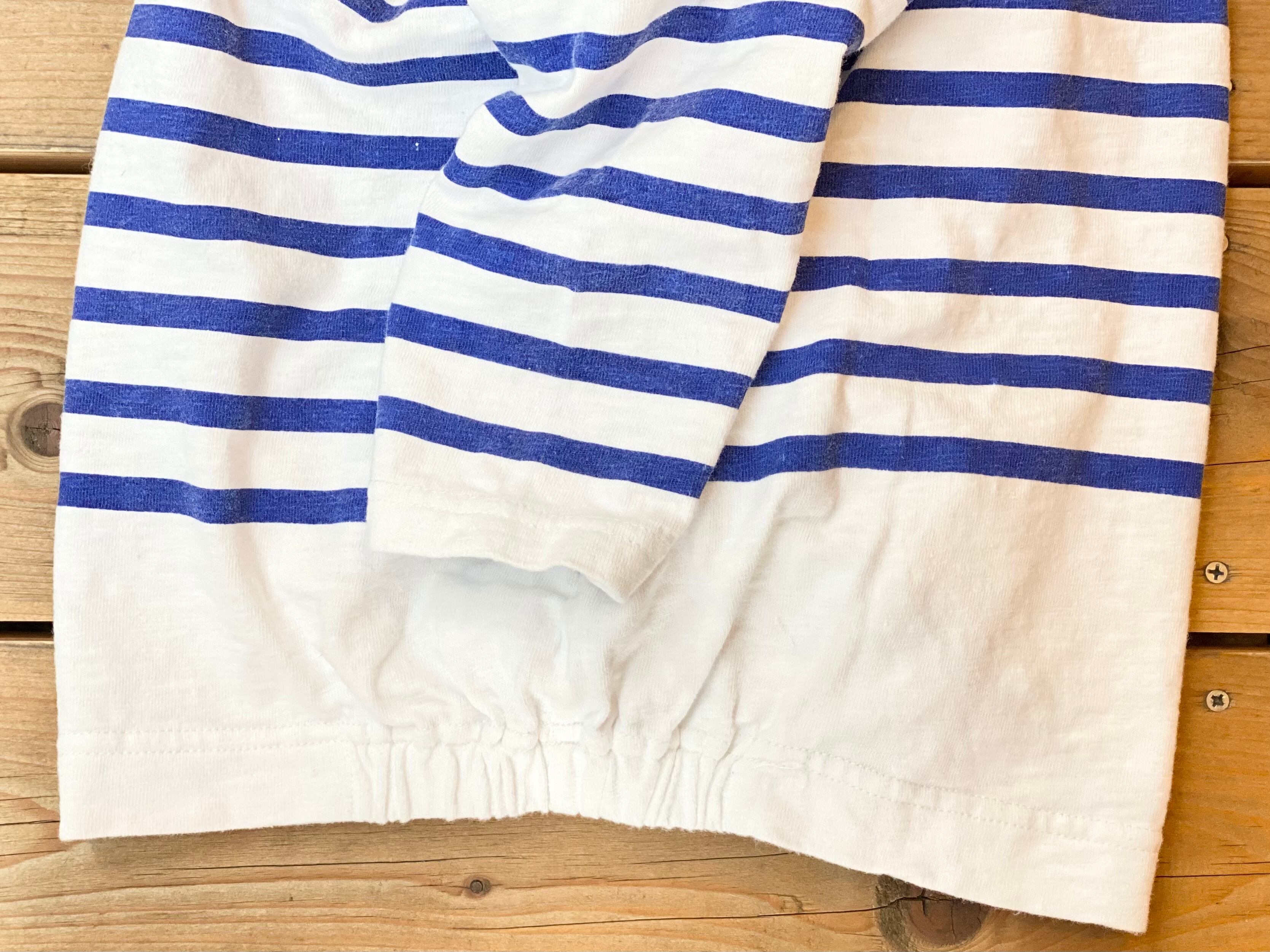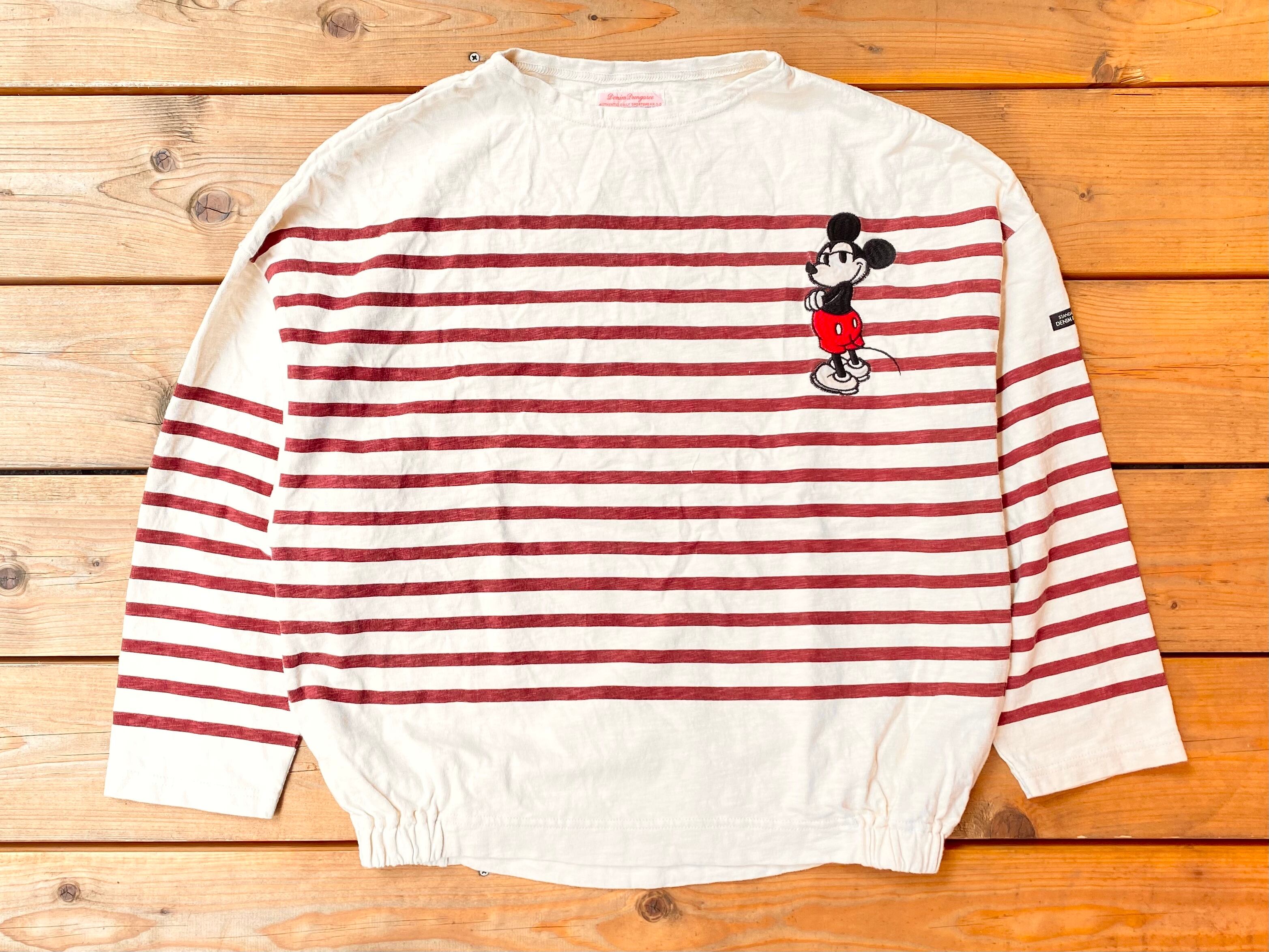 風合いのあるボーダーに、立体感のある刺繍のミッキーがインパクトのある一枚。