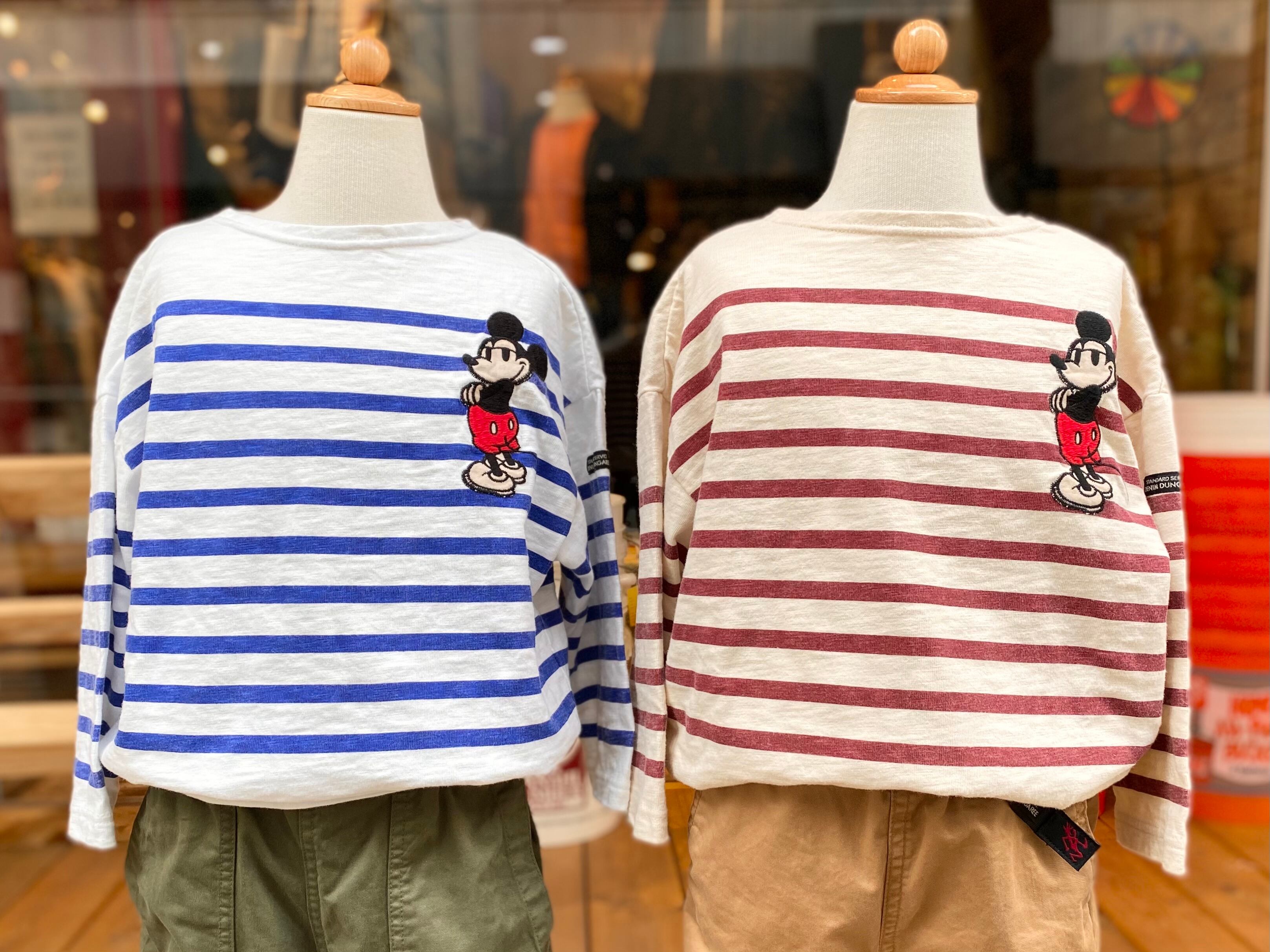 風合いのあるボーダーに、立体感のある刺繍のミッキーがインパクトのある一枚。