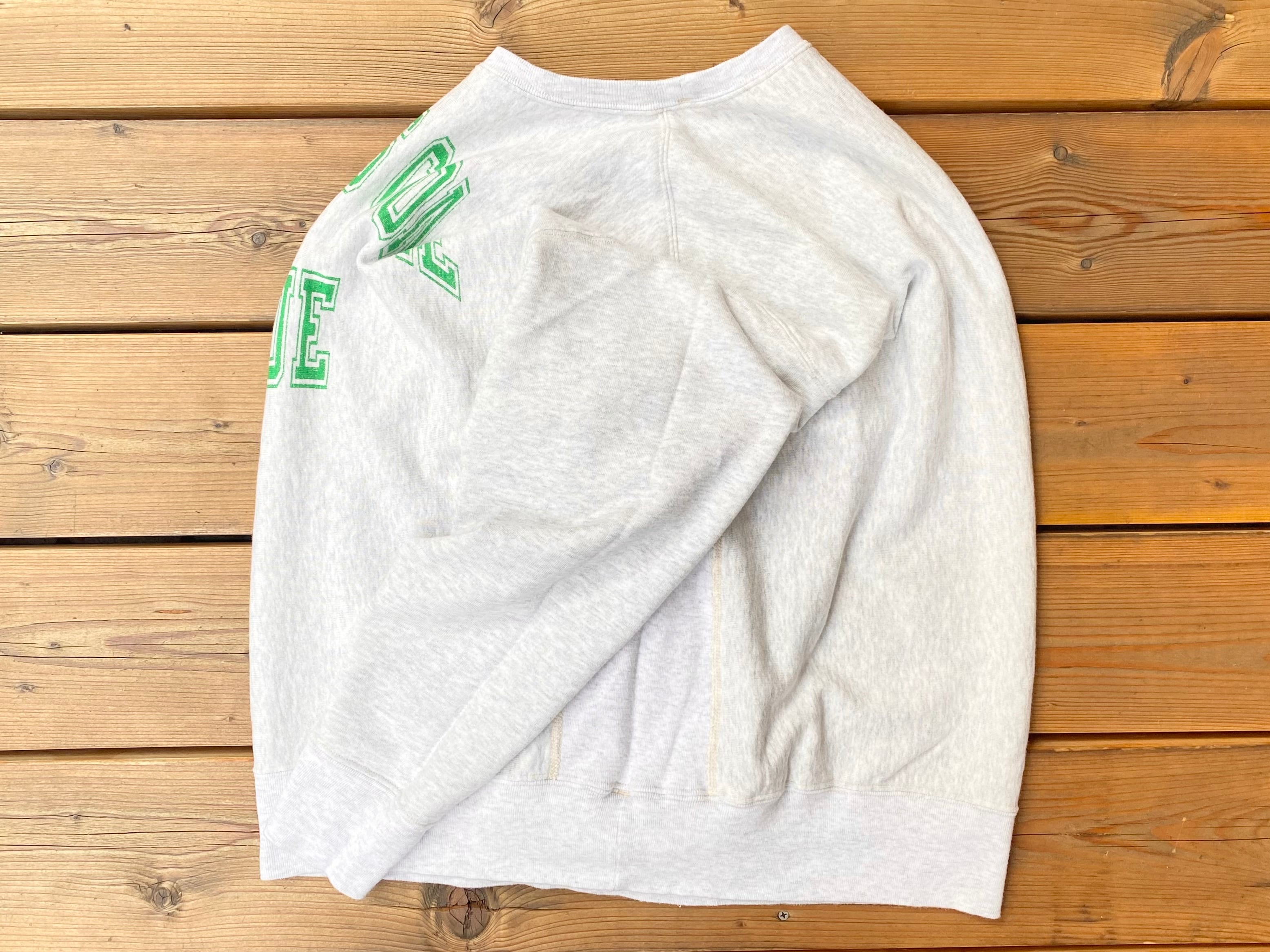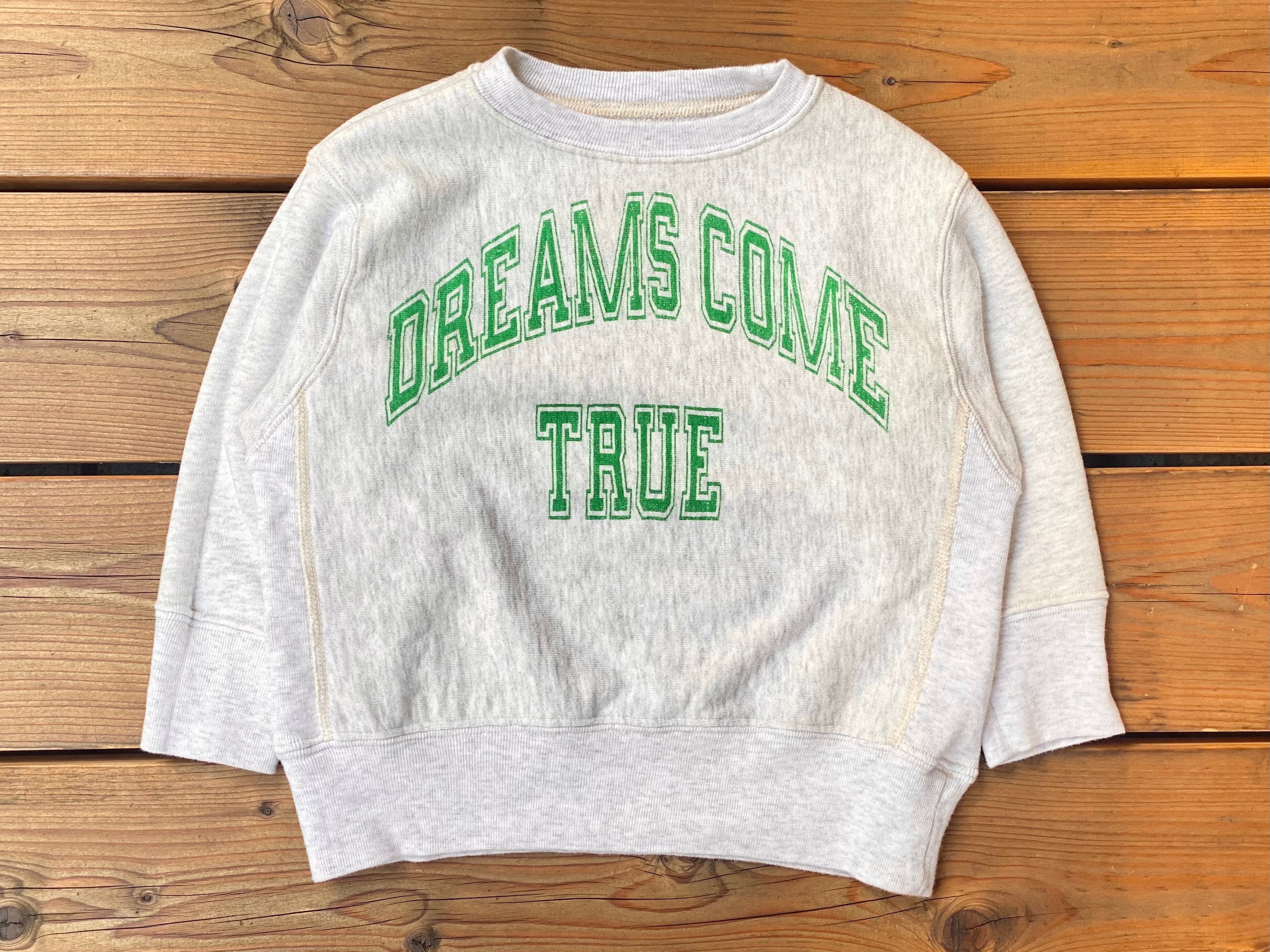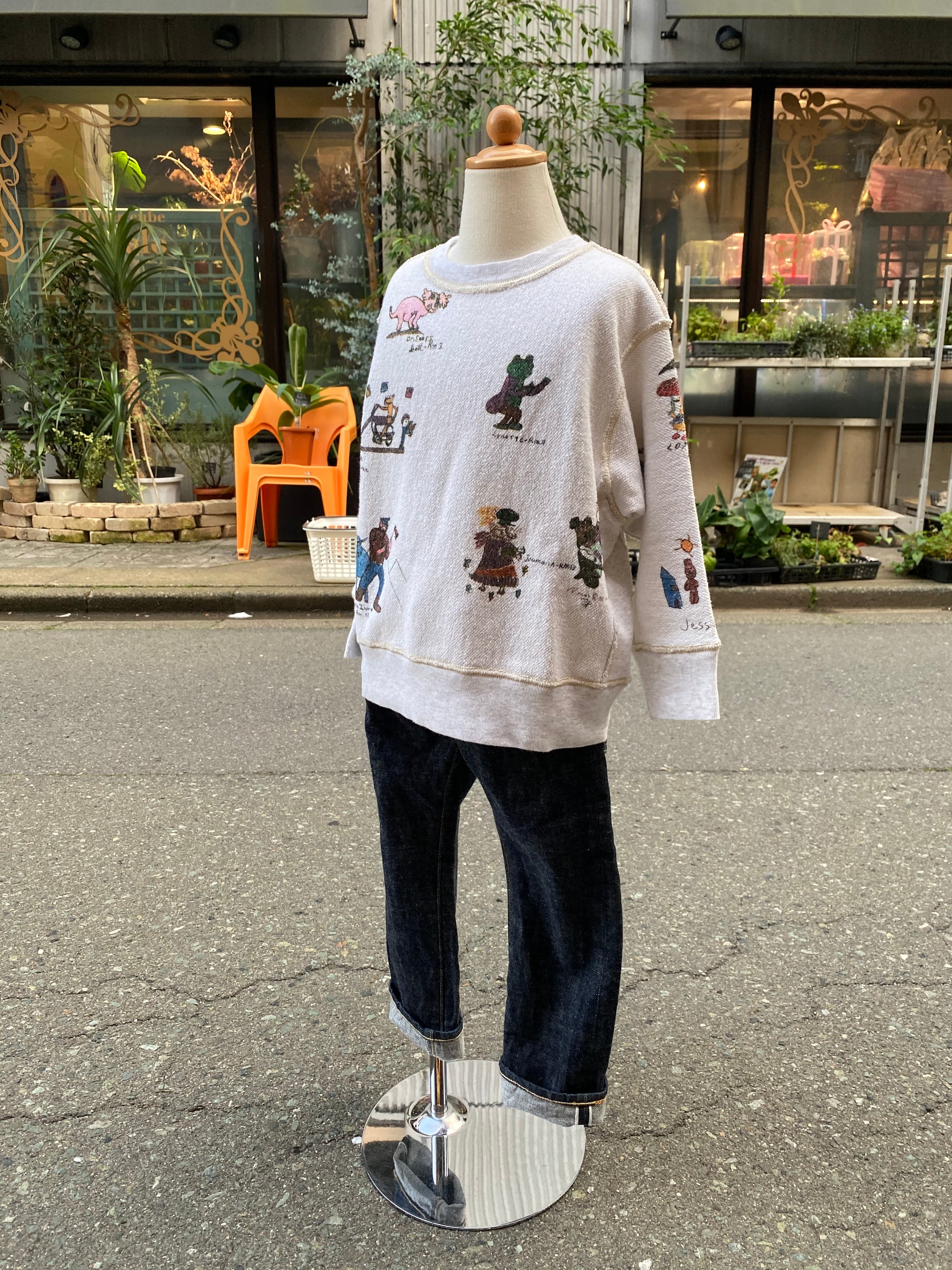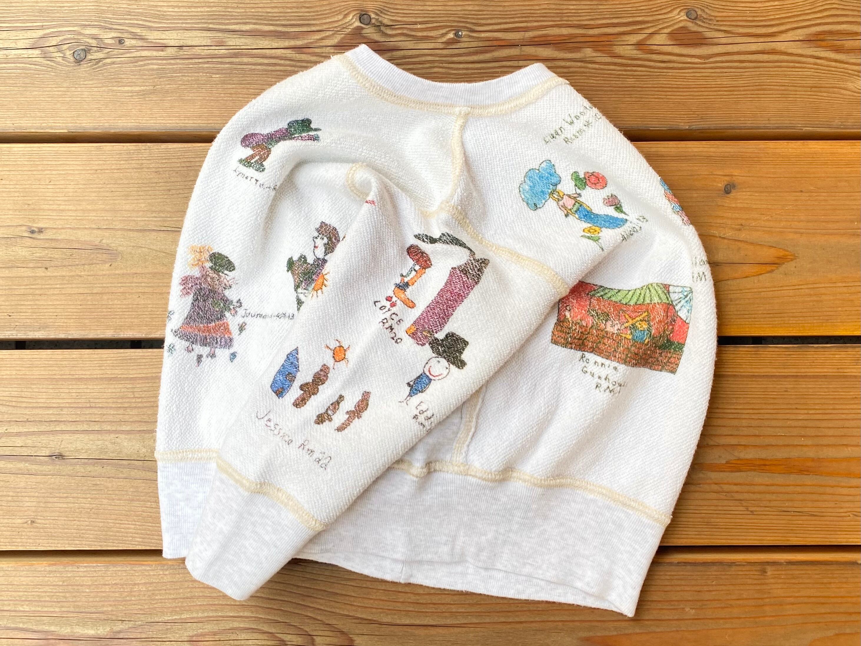 表はカレッジ風のスウェットで、ひっくり返すと裏のパイル地に子供のお絵描きが描かれている面白い仕掛けのリバーシブルスウェット。