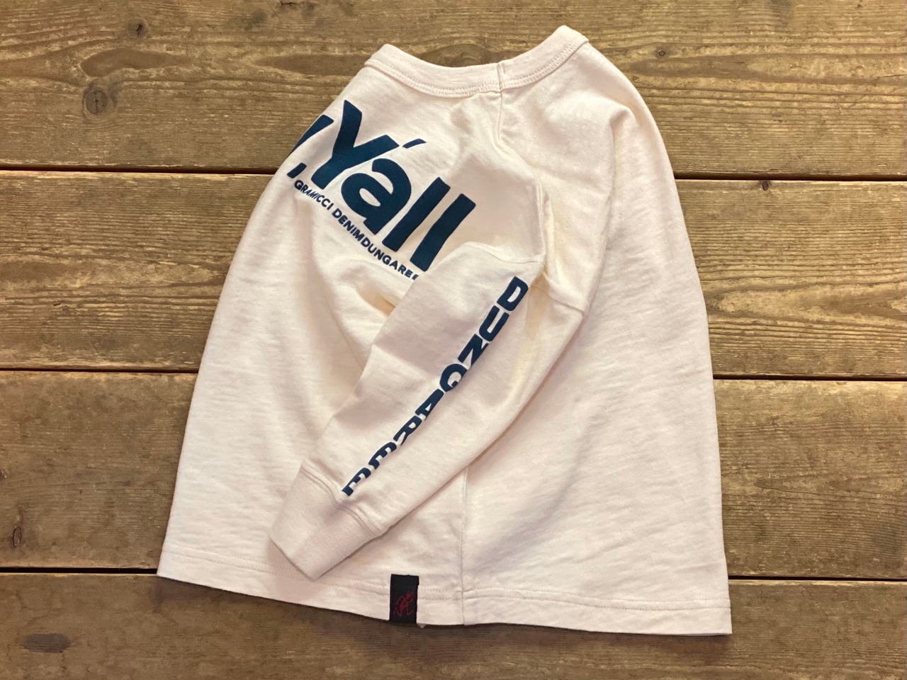 袖にはDENIM DUNGAREEのプリント、後ろ右裾にクマのイラストが入ります。