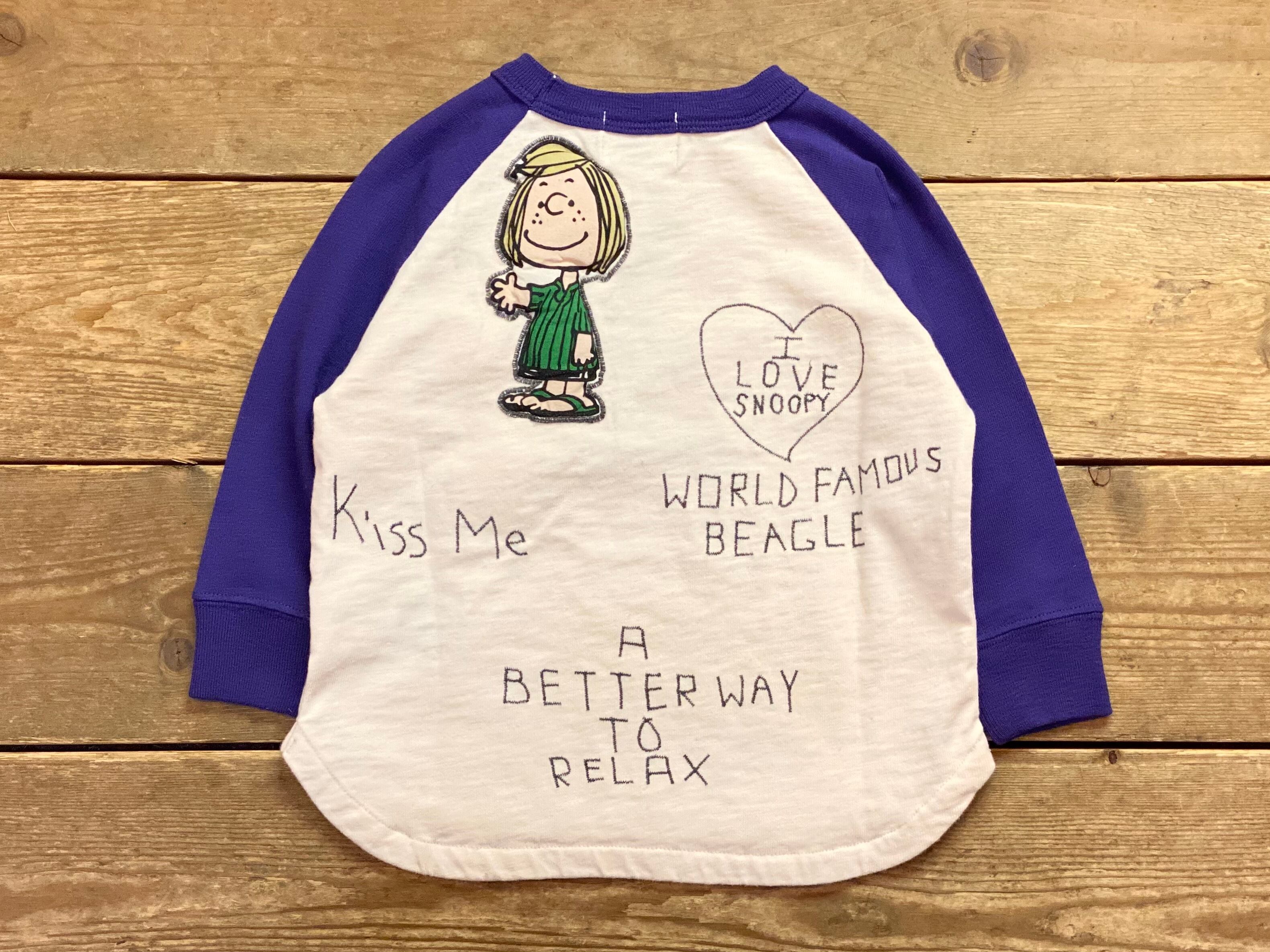 無地のラグランTシャツに、スヌーピーの布団カバーを切って貼り付けた設定のデザイン。