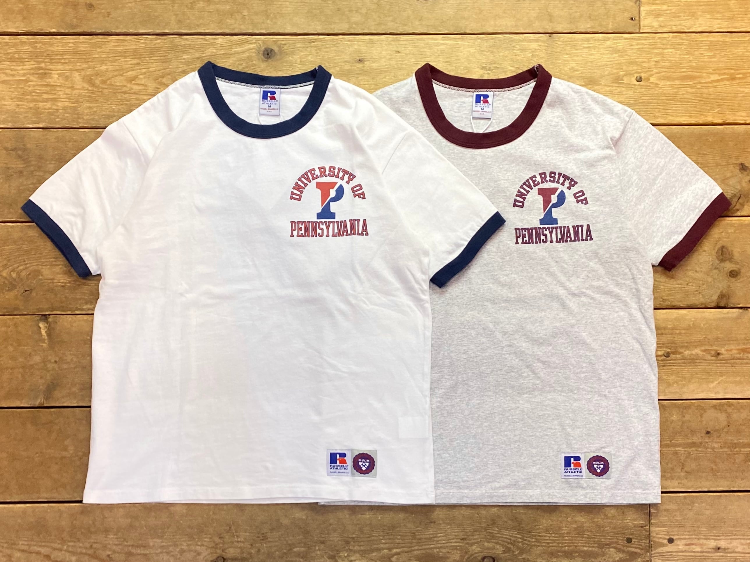 RUSSELLのベーシックなコットン100%ジャージーに、ペンシルバニア大学のロゴを落とし込んだリンガーTシャツです。
