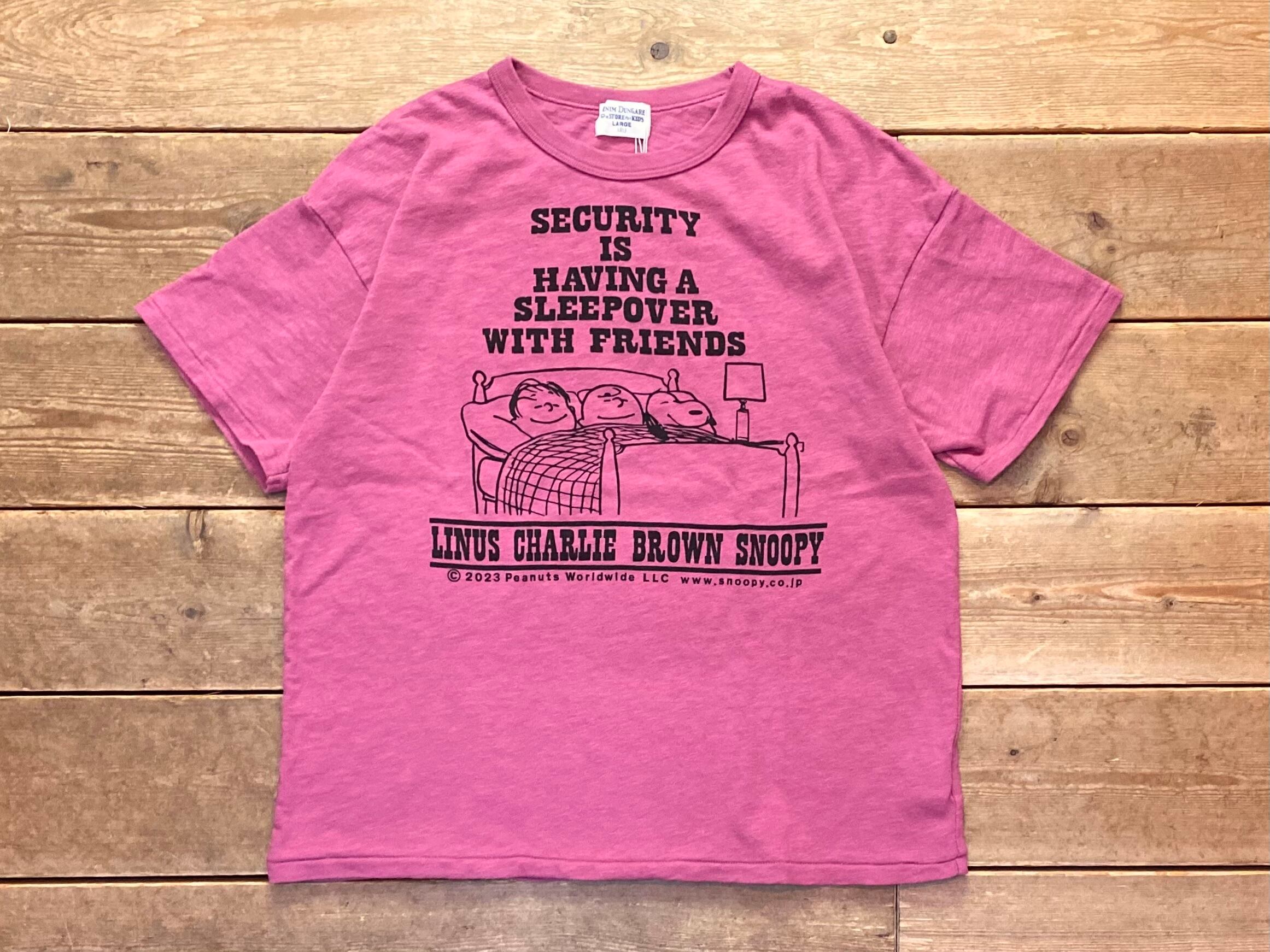 ライナス・チャーリーブラウン・スヌーピーが並んで寝ているコミックが可愛いTシャツ。
