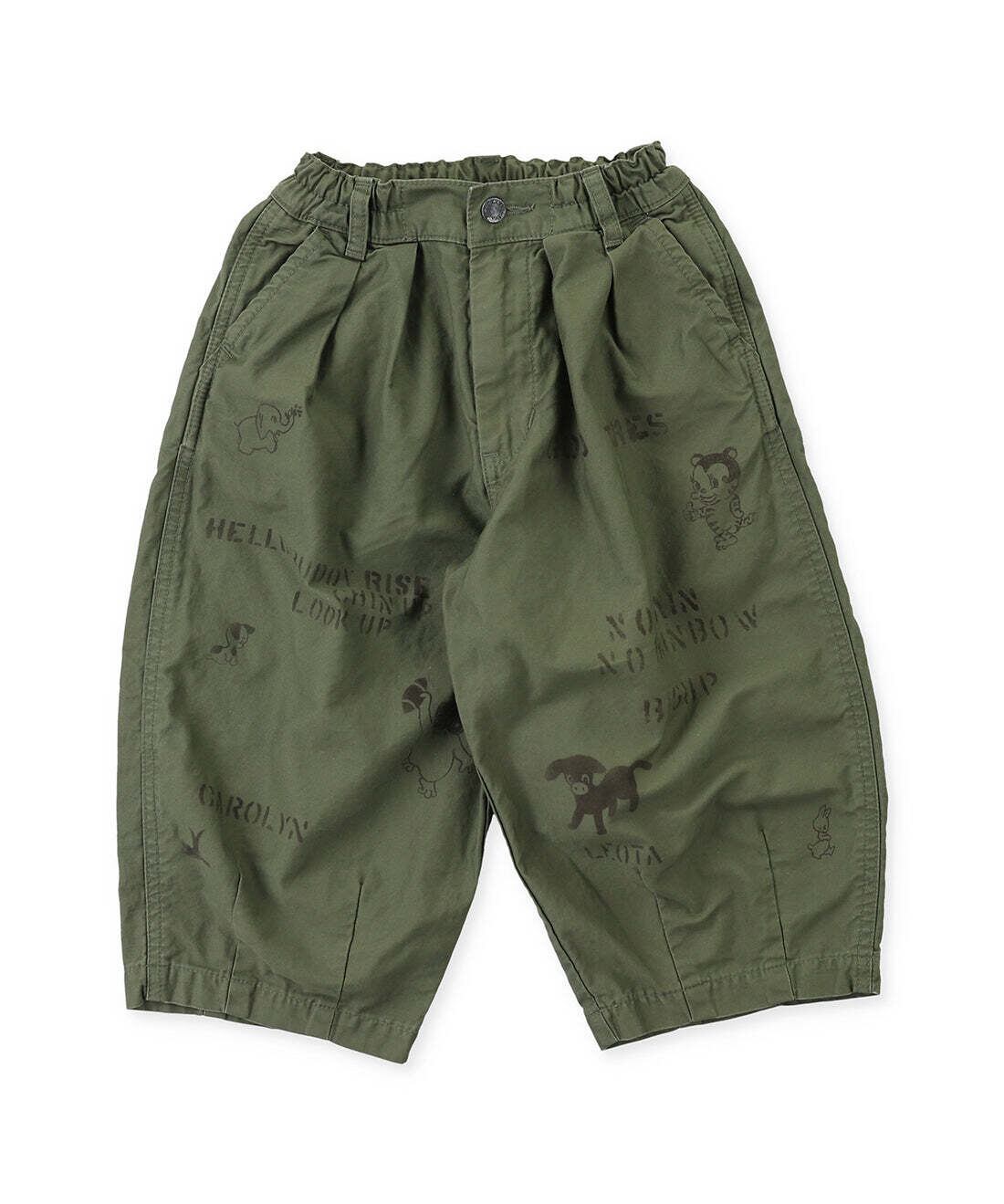 フロントに動物のステンシルプリントが入った太めのサーカスパンツ。