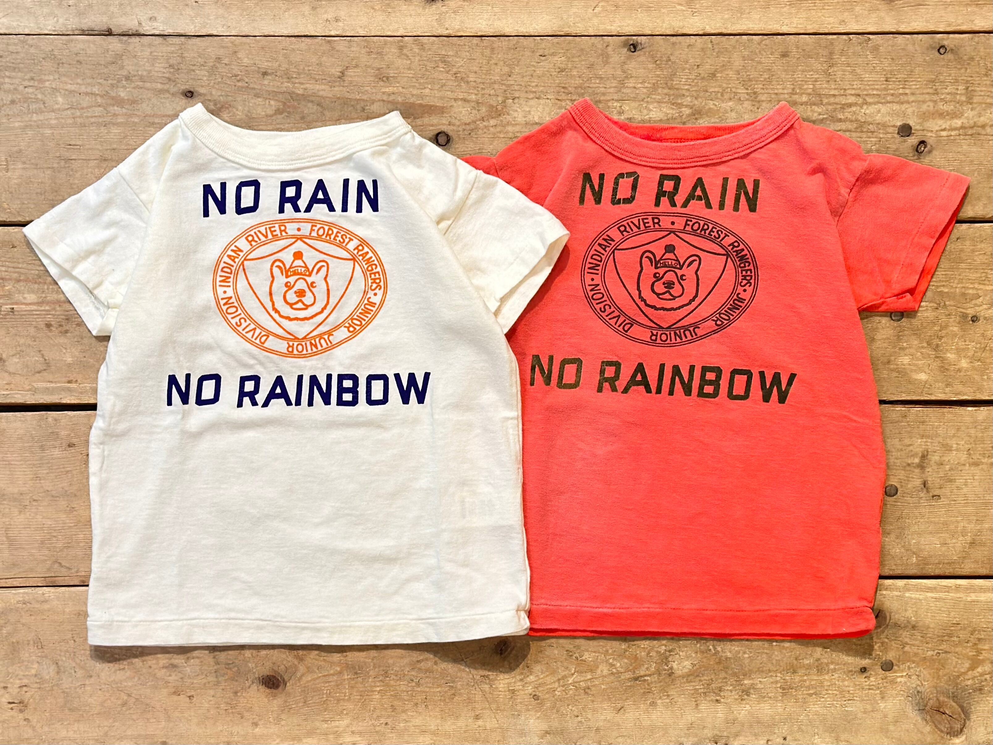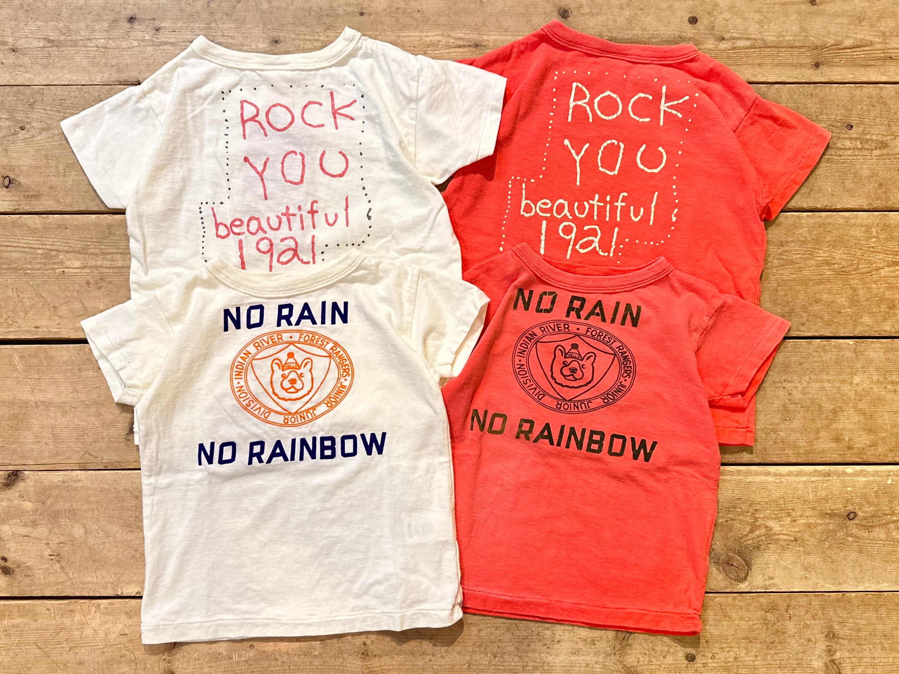 犬(ブルドッグ)マークのキャンプTシャツにNO RAIN NO RAINBOW(雨という試練があってこそ美しい虹を見ることが出来る)と持ち主がフロッキーシートで一枚づつ付け、後ろには手書きで良い人生、と書いた設定のTシャツ。