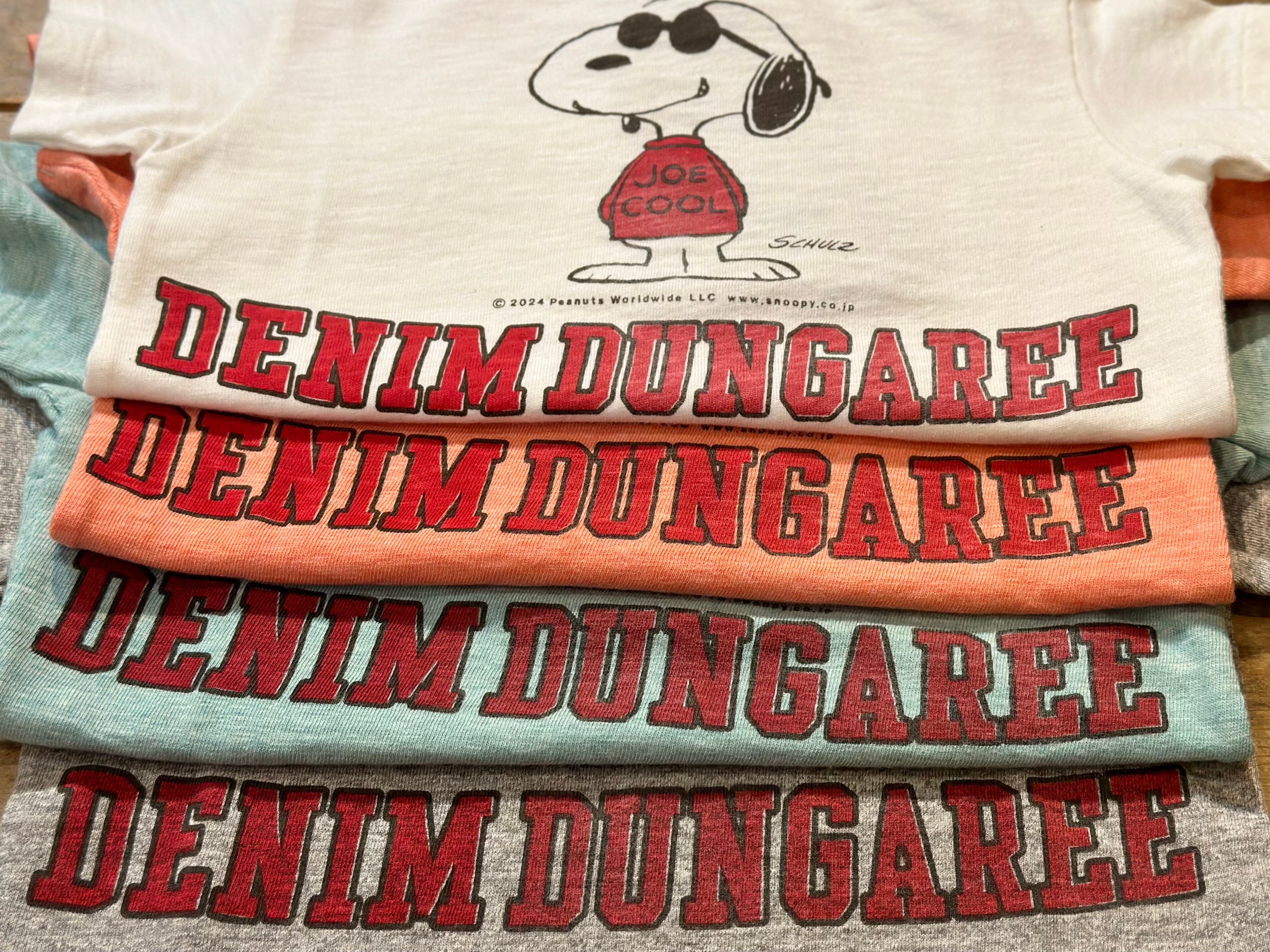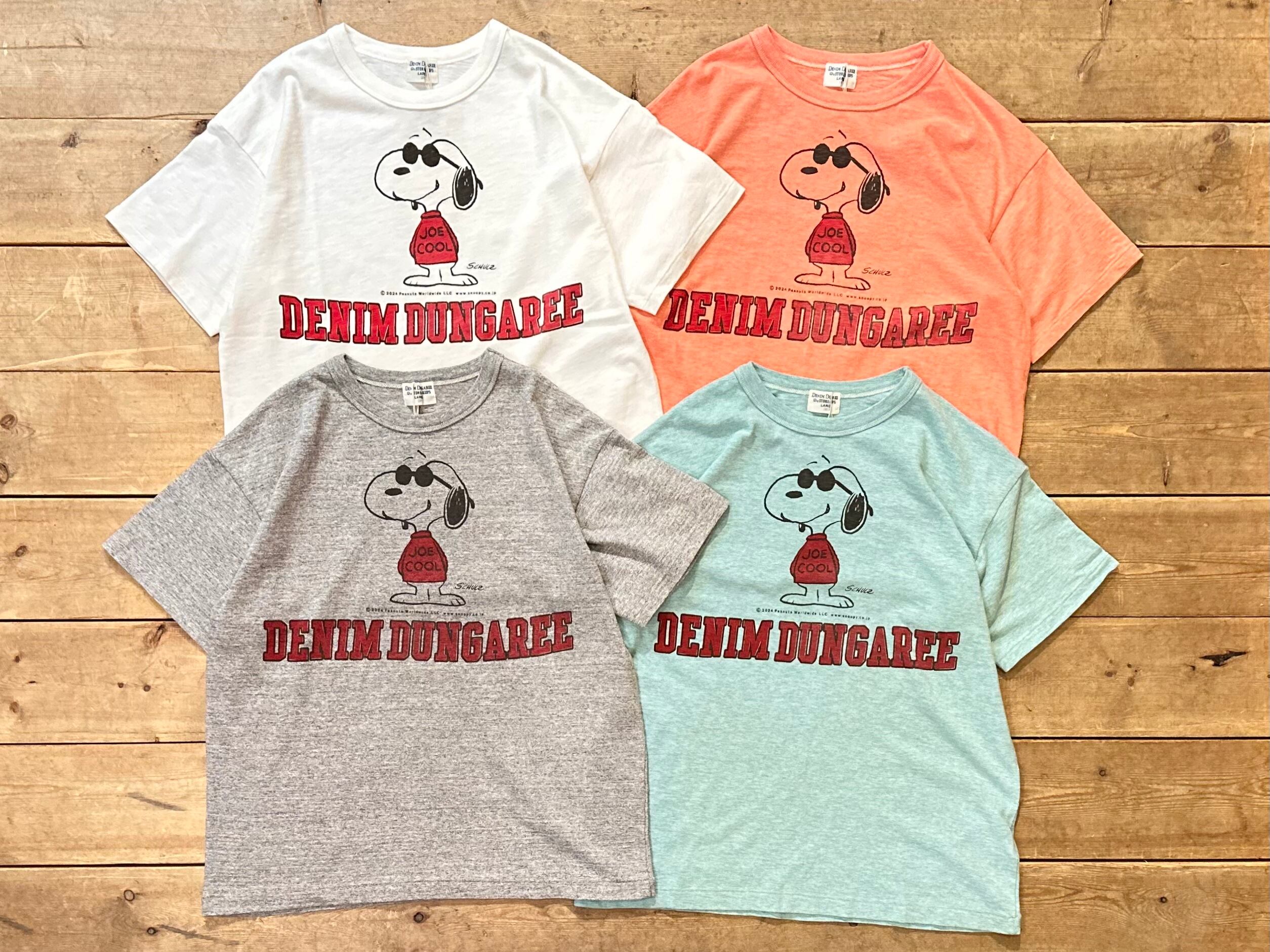 前に大きくJOE COOL、下にはDENIM DUNGAREEの文字が入ったスヌーピーコラボTシャツ。